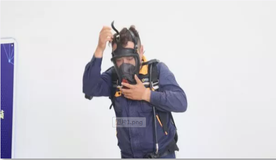 “穿戴完畢后,舉手示意.....”計時開始,一名職工迅速拿起桌上的空氣呼吸器,按步驟一步步穿戴整齊,動作干凈利落,他們要在最短時間內完成呼吸器的正確穿戴。
